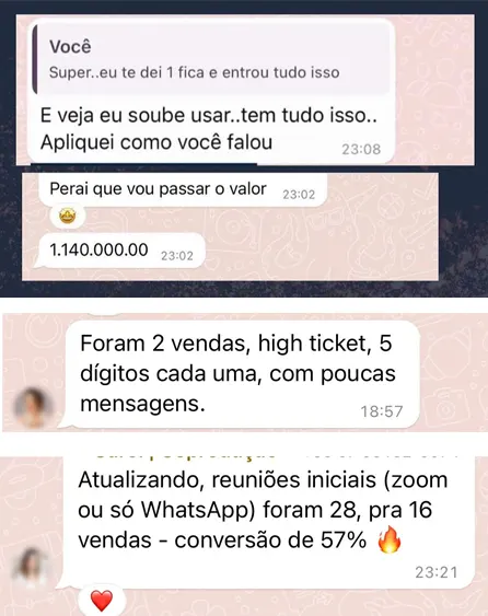 Aqui tem o ouro. Todas as possibilidades de conduções de conversas, possíveis objeções e situações e uma passo a passo prático de como fazer em cada conversa no Whatsapp.